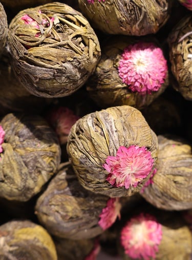 Гибкие чайные листья обвязывают вокруг настоящих цветочных бутонов: розы, хризантемы, жасмина, лотоса, османтуса или других – зависит от задачи, то есть от того, какой сценарий распускания хотят получить в итоге. Результат работы – упругий шарик, в сердцевине которого скрыт цветочный сюрприз. Это может быть один бутон или несколько цветов, распускающихся поэтапно вертикальными каскадами. И да, «вяжут» чай всегда вручную, без исключений.